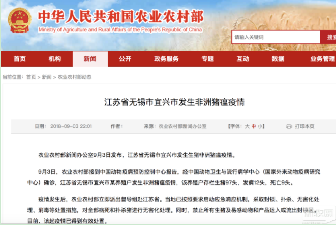 农业农村部新闻办公室9月3日发布,江苏省无锡市宜兴市发生生猪非洲猪瘟疫情。
