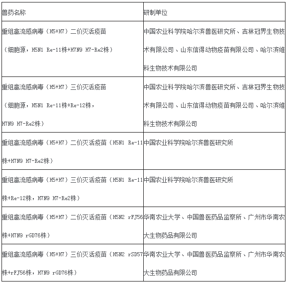 近日,农业农村部官网发布公告,公告公布了重组禽流感病毒(H5+H7)二价灭活疫苗(细胞源,H5N1 Re-11株+H7N9 H7-Re2株)等6种兽药产品制造及检验试行规程、质量标准、说明书和内包装标签,自发布之日起执行。